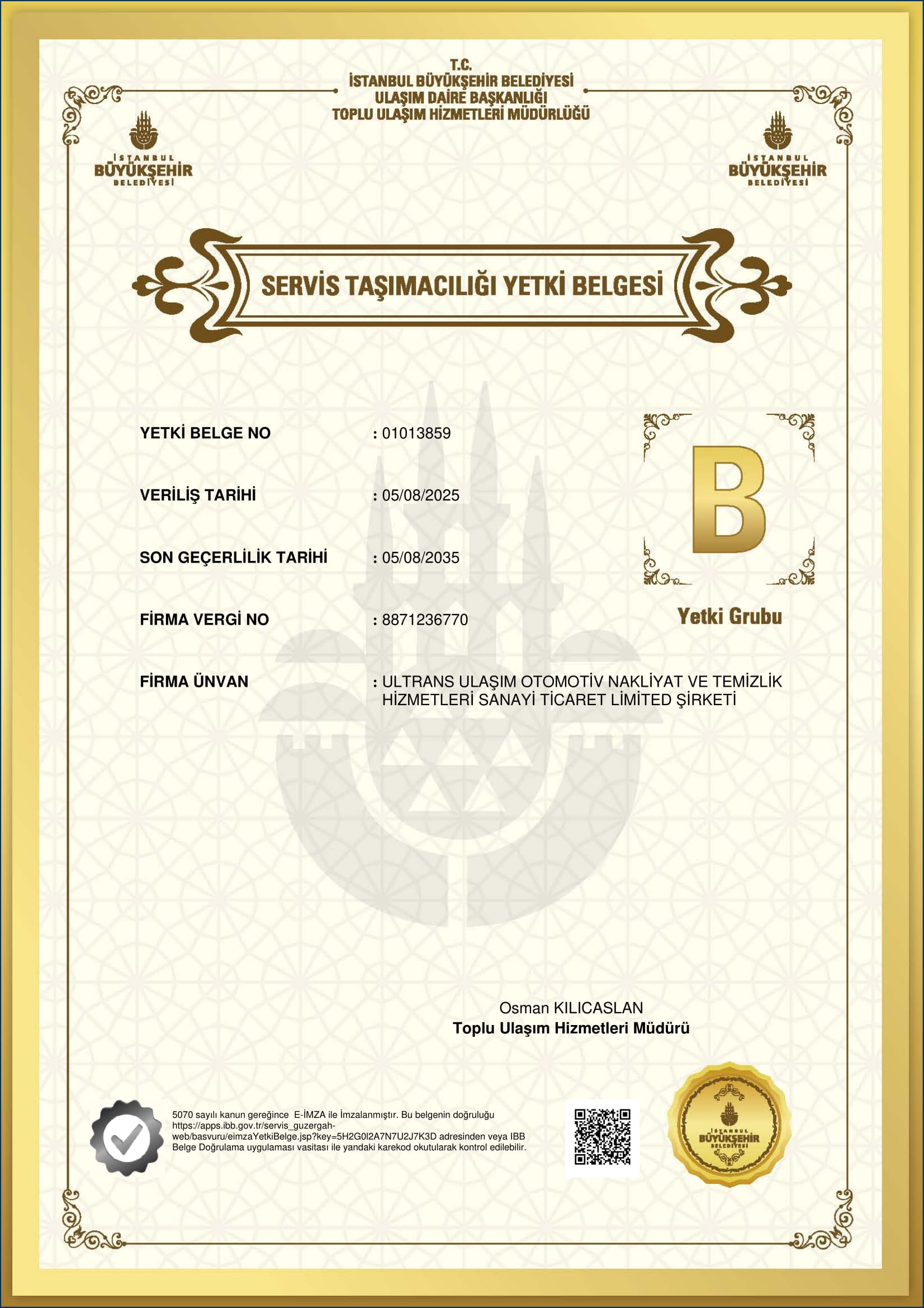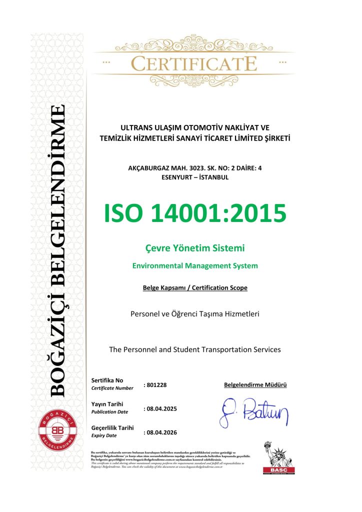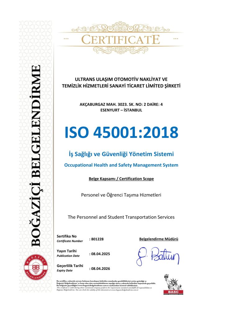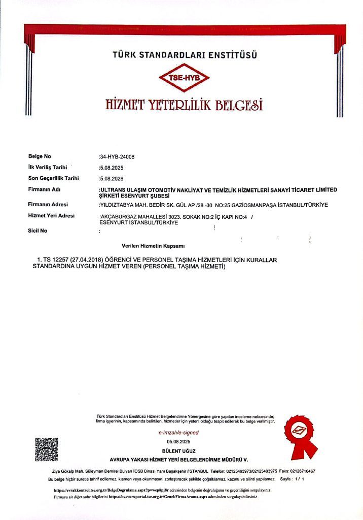 ULTRANS TURİZM olarak servis taşımacılığı yetki belgesi, TSE 12257, ISO 9001, ISO 14001, ISO 45001, kalite, yönetim, yetki belgesi ve diğer gereken tüm belgelerimiz mevcuttur.