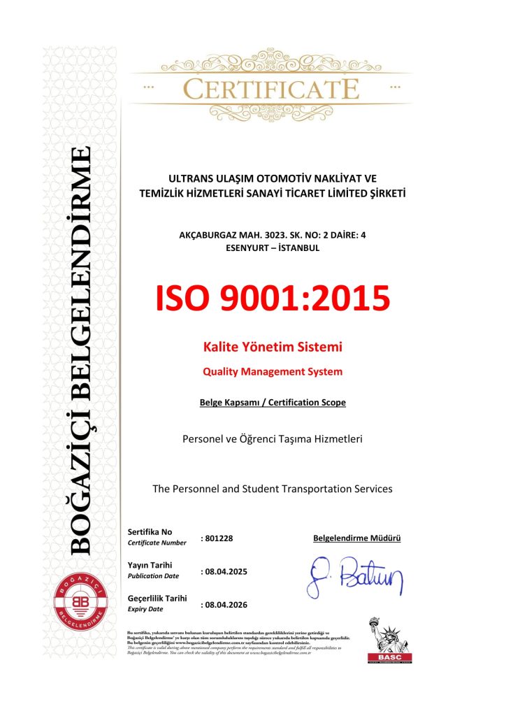 ULTRANS TURİZM olarak personel taşımacılığı, öğrenci servisi hizmetleri ve diğer tüm taşımacılık faaliyetlerimizi yasal koşullara uygun ve kalite yönetimi sistemlerine elverişli yapı ile gerçekleştiriyoruz. Kalite sistemi gereğine uygun olarak, her gün daha fazla iyileştirme koşuluyla müşteri memnuniyetini ve güvenliği en üst seviyede tutabilmek için var gücümüzle çalışıyoruz.